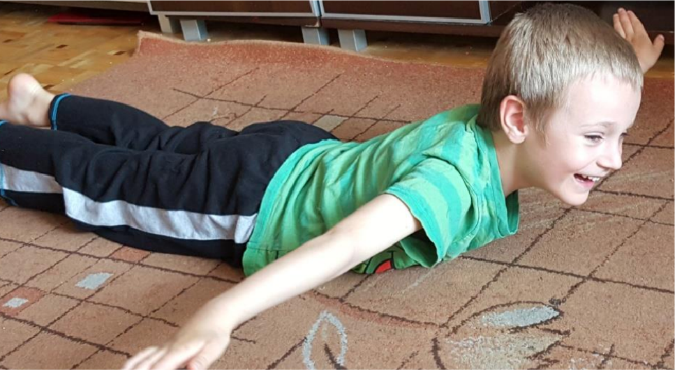 OPIEKUN: Musimy najpierw sprawdzić czy nasz samolot jest sprawny. Zrobimy test. Połóż się na brzuchu, wyciągnij przed siebie ręce i kręć nimi jakby to były śmigła samolotu. Łokcie staraj się trzymać w górze – nie dotykaj nimi podłogi.
